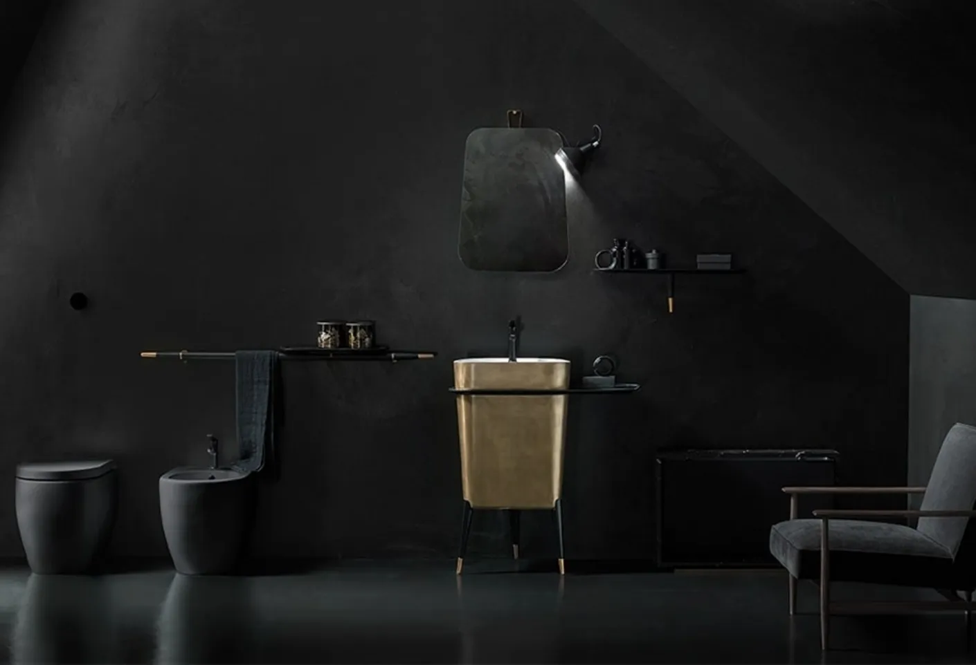 Free 04 washbasin in Metallic Bronze by Cerasa: click and get information on floor-standing bathroom furniture in matte lacquered finish and accessory elements from the brand.