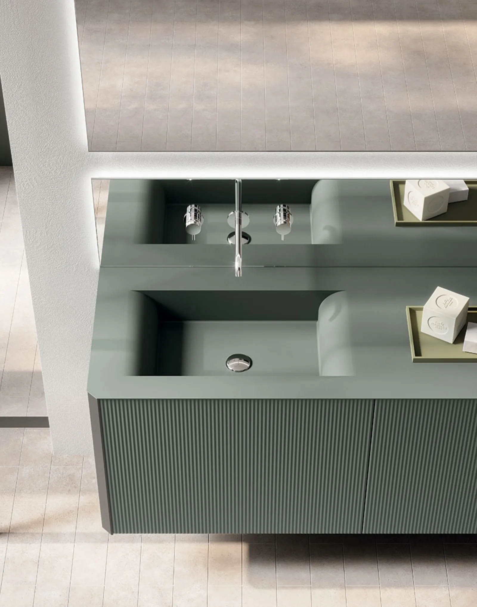 Discover more about modern bathroom furniture: suspended bathroom furniture in matte lacquer like the Honey 02 model from Cerasa are waiting for you.