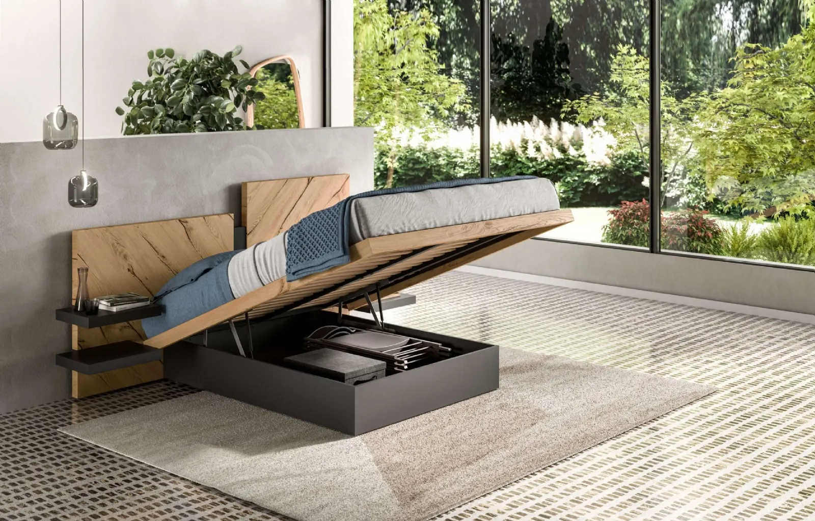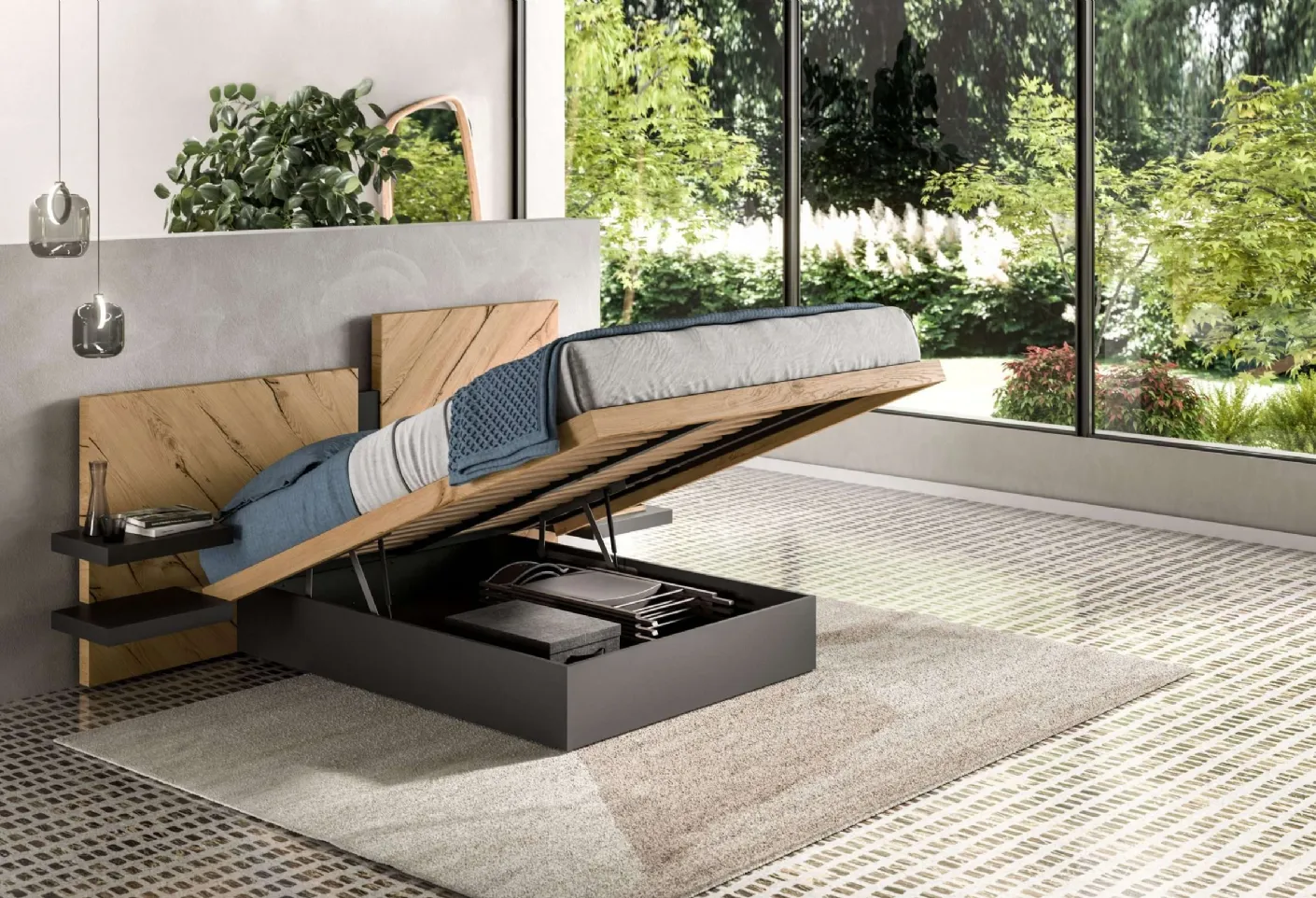 The Nazarè bed by Ozzio creates an intimate and comfortable space in any room, ensuring you the best rest and a unique style. When purchasing a good bed model, carefully consider its dimensions, materials, shape, and style in relation to the rest of the furniture. The brand's double beds with storage, a leader in the production of home furnishings for the bedroom, are designed to be paired with all kinds of furniture and accessories, such as wardrobes, bedside tables, lamps, and floor lamps. Choose colors and textures and create your furnishing concept in the room, designing it just as you had dreamed. If you want a wooden solution, the model visible in the photo is characterized by high-quality materials and clear shapes, which invite a deep and restorative rest.