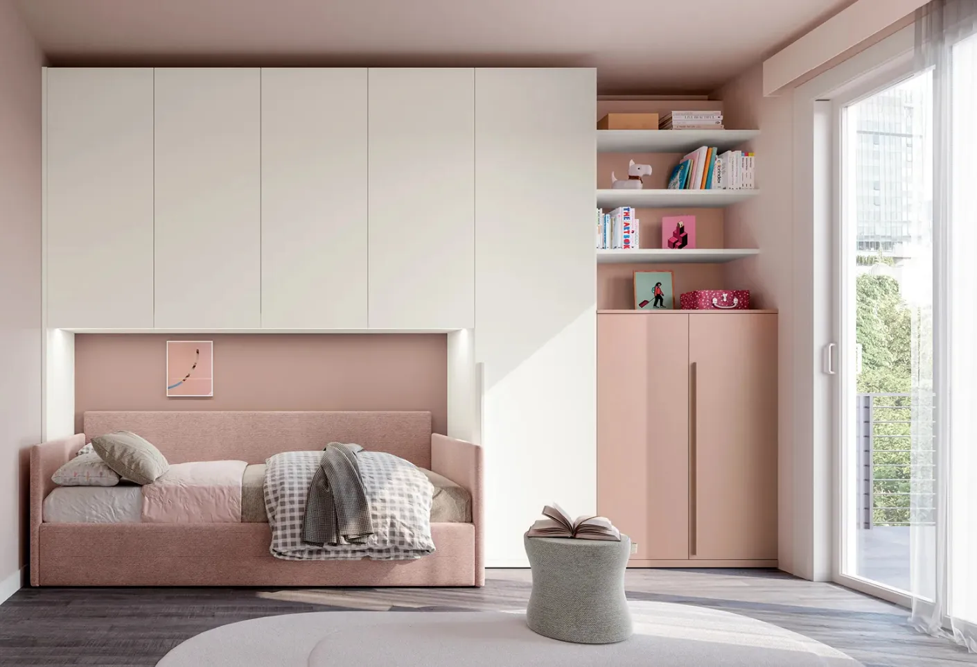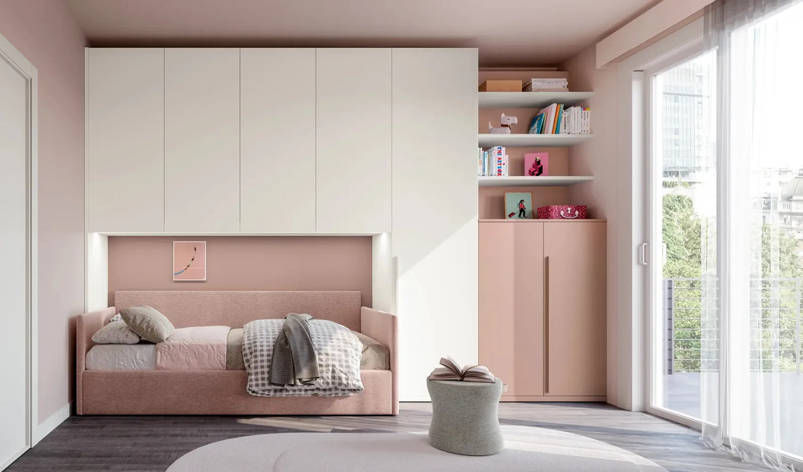 Bring aesthetic value and bright colors into the room dedicated to the youngest with this proposal, one of the bunk bed rooms for girls by Doimo Cityline. If you are looking for design ideas to furnish your children's room, we present to you the Layout 01B room by Doimo Cityline with a matte lacquered finish. When designing the room for young people, trust us: in our showroom we present all the most original modern compositions for their bedroom. This solution in matte lacquer enhances the functionality and aesthetic value of the room, as it is able to combine ergonomics and safety. Doimo Cityline offers a rich catalog of accessory elements to be customized: you will find a bed, wardrobe, work table, chairs, and bookcases.
