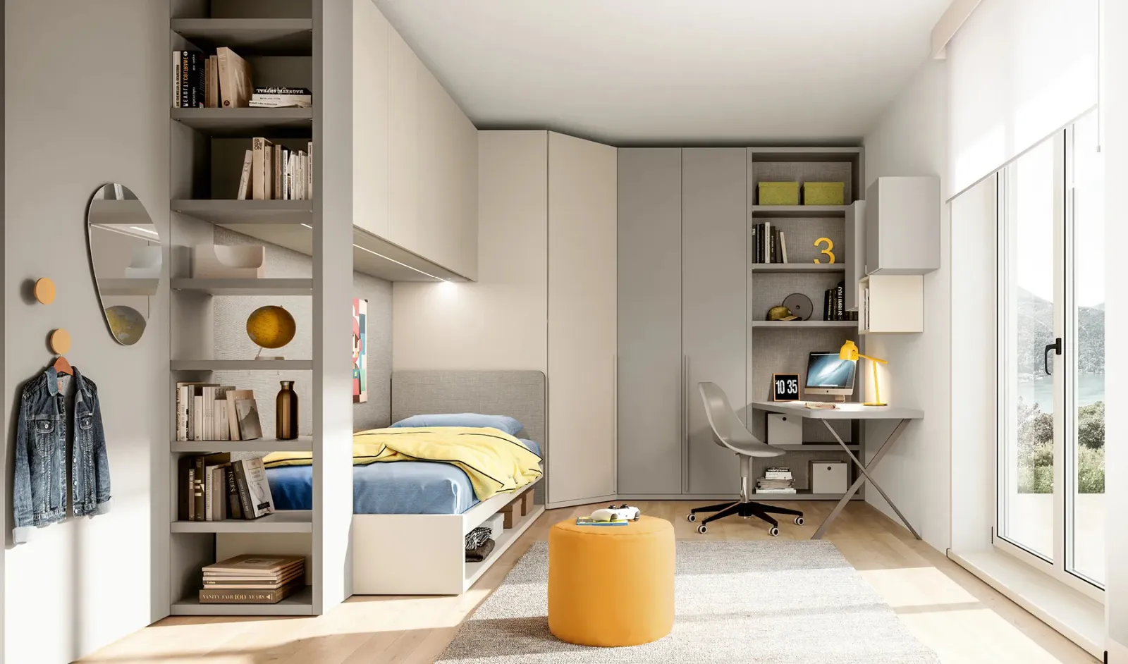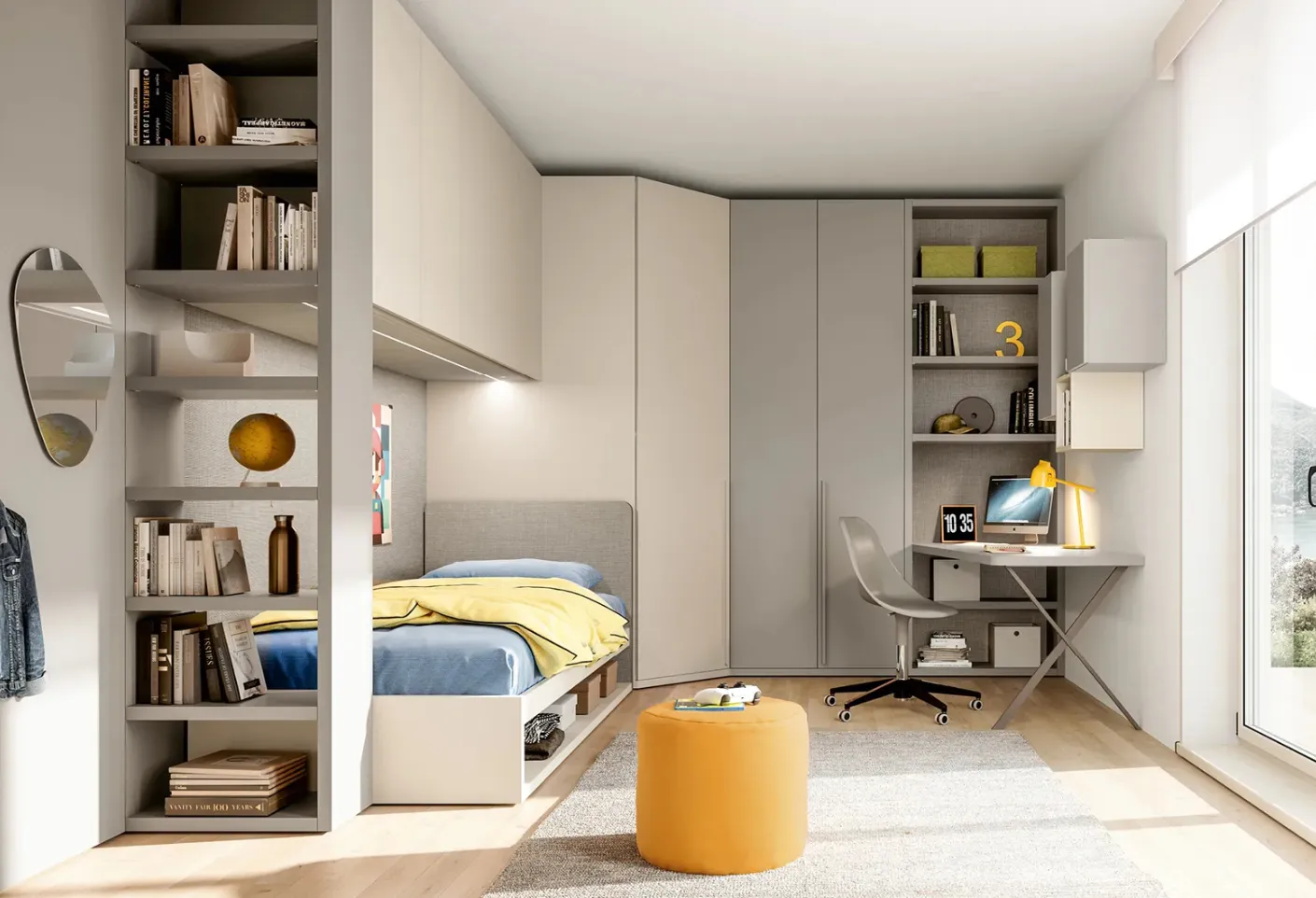 Doimo Cityline offers a rich catalog of customizable accessories: you will find a bed, wardrobe, work table, chairs, and bookcases. This solution in matte lacquer perfectly combines functionality and aesthetics in the bedroom, as it is able to combine ergonomics and safety. If you are looking for design ideas to decorate your children's room perfectly, we propose the Layout 02B Children's Room by Doimo Cityline with a matte lacquer finish. Trust us for the design of your children's room: in our showroom, we offer all the most beautiful modern compositions for their room. Bring aesthetic content and bright colors into the space dedicated to the youngest with this proposal, one of the Loft Bed Children's Rooms by Doimo Cityline.