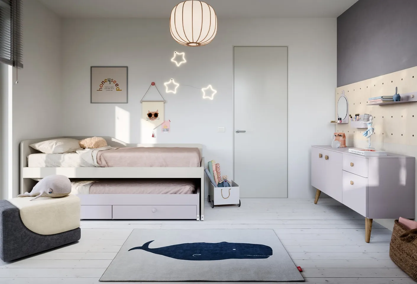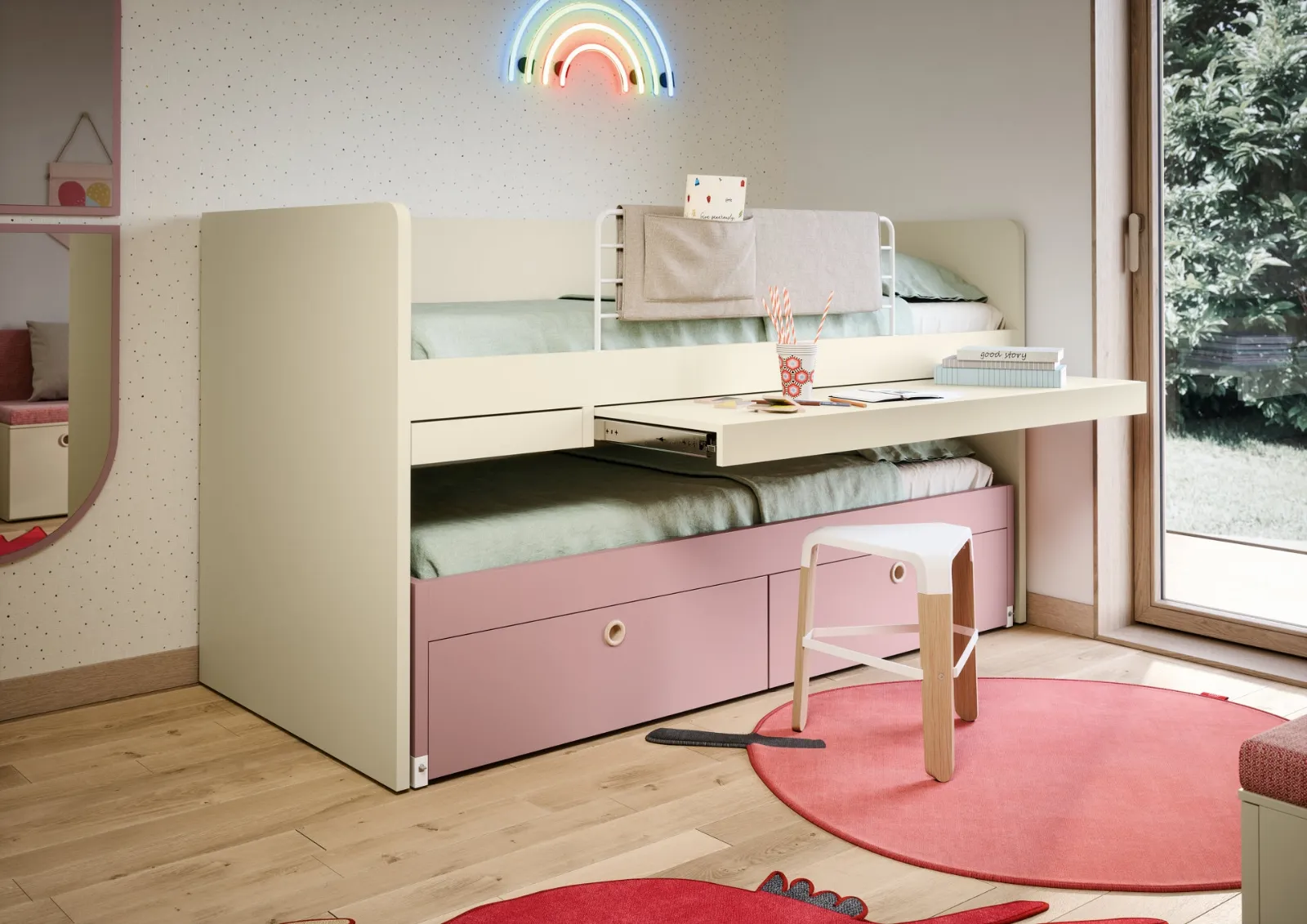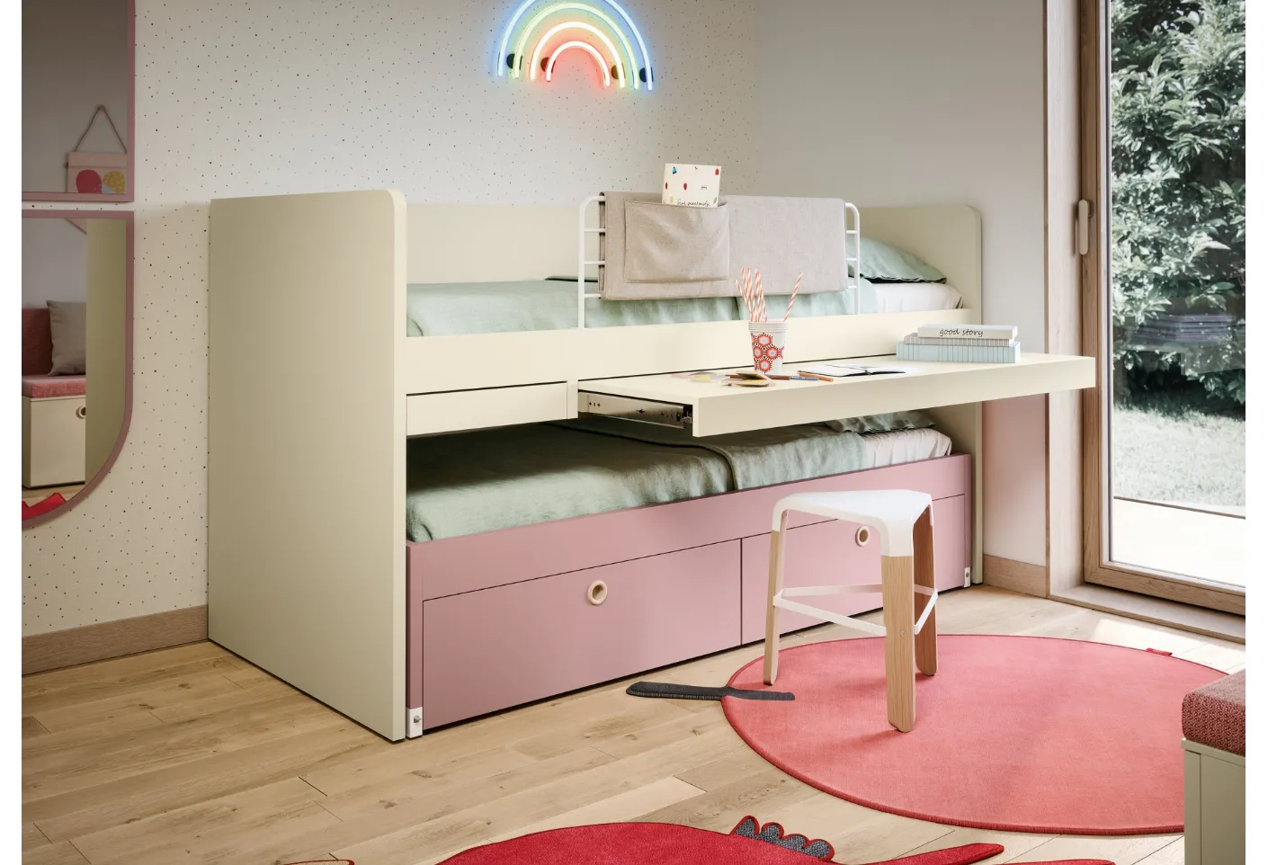 Furnish modern rooms with space-saving Children's bedrooms Nidi! The Turca space-saving model in melamine is for girls.