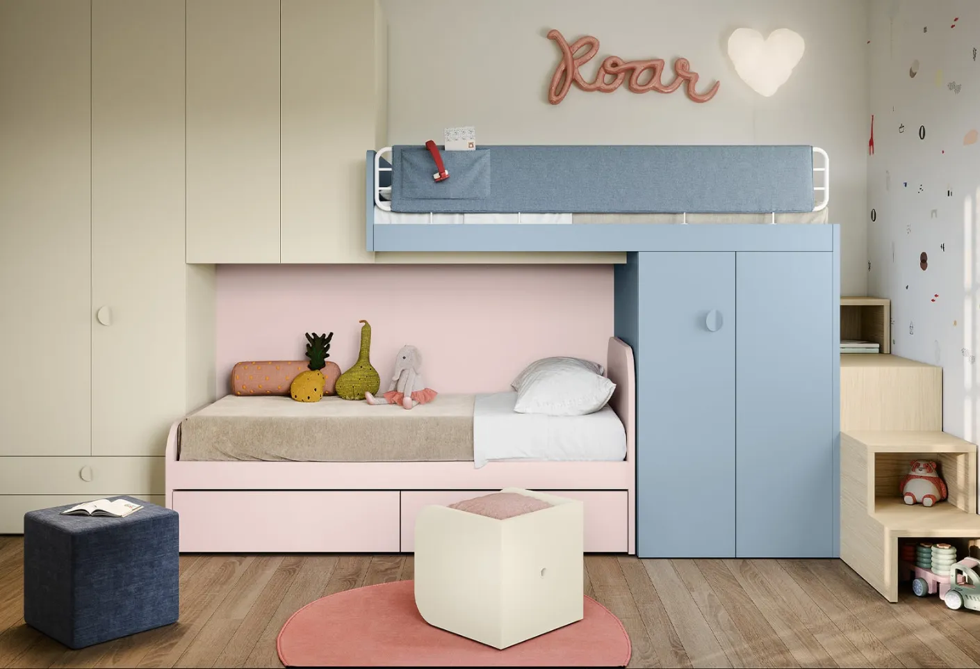 We present various modern lofted children's bedrooms in our showroom from the brand, ideal for accompanying them during their development. With the lofted bed children's bedroom from Nidi in melamine, you will ensure a perfect combination of ergonomics and safety, ideal for your children's room. Our children spend hours of the day in their bedrooms: make them suitable for studying, playing, and resting every day. Our children's bedrooms are the environment in which they will spend their early years playing and dreaming, so it is essential that the space is functional.