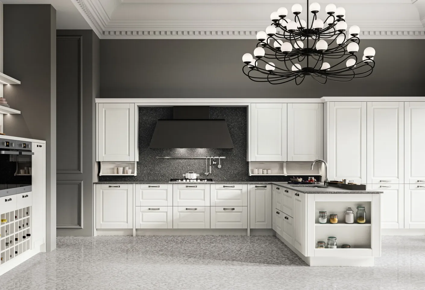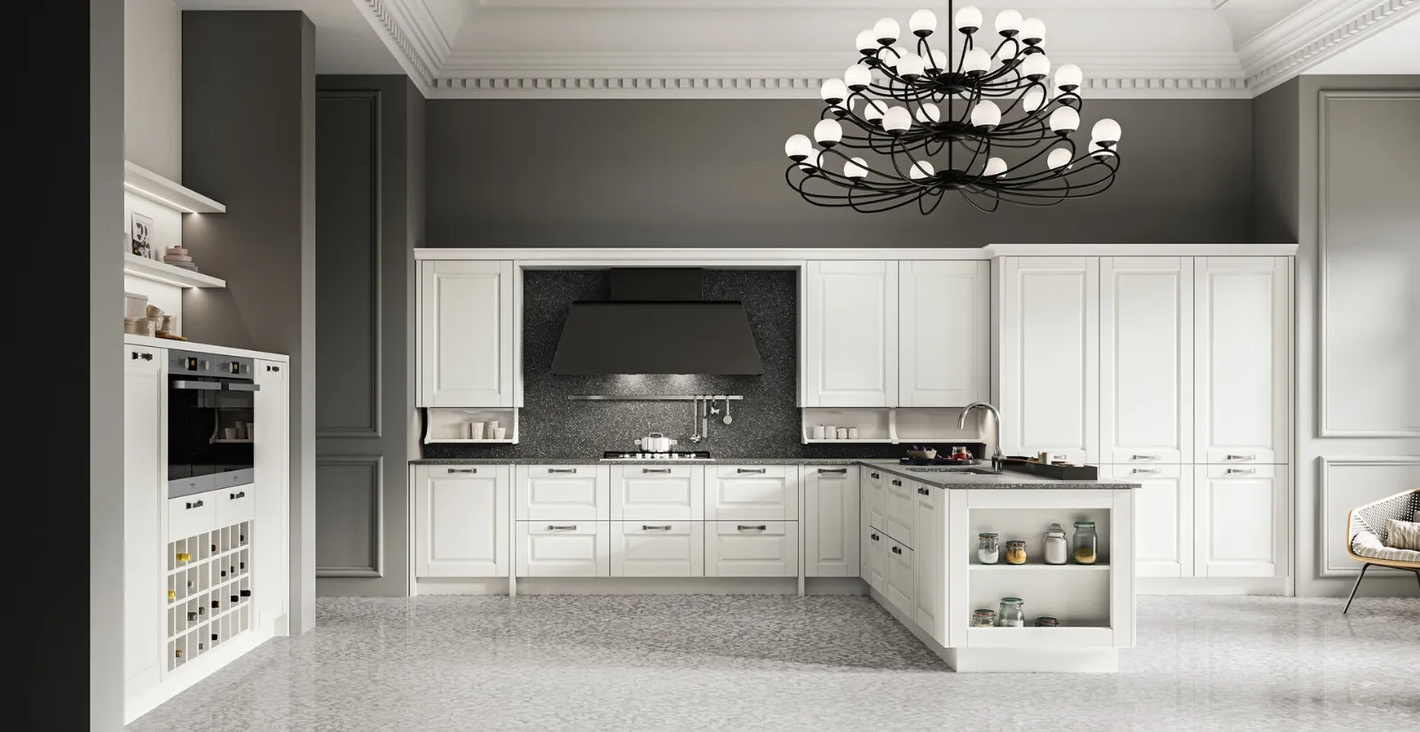 If you are looking for a product with a classic taste that will last for years while maintaining its original beauty, choose a high-quality and durable classic kitchen in matte lacquer, such as the one available here. The Classic Kitchen with peninsula Asolo 04 by Arredo3 in the photo offers a highly functional, elegant, and refined style, embodying the typical romantic flavor of classic kitchens.