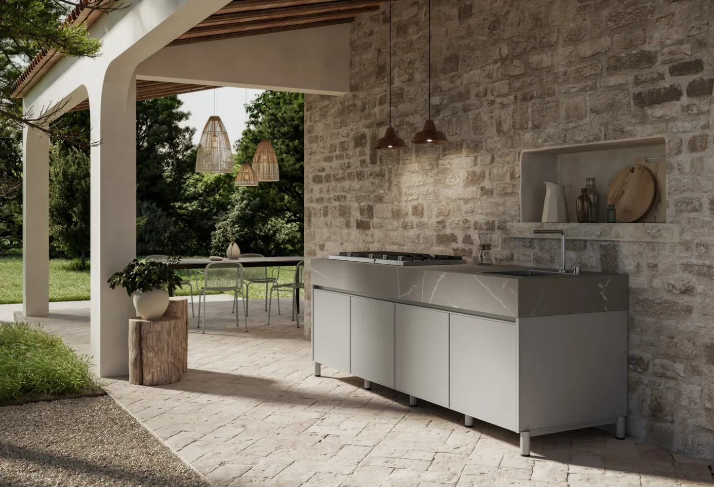 Consider that the kitchen area is a place subject to the action of steam and heat: the proposal in the photo, like all Modern Kitchens on the market, requires care and maintenance. In our store, a rich catalog of Arredo3 Modern Kitchens of great charm is waiting for you, in different trendy colors and materials and in multiple shapes. The purchase of the new kitchen will depend on the layout of the room, its style, and your needs for space, functionality, and storage. Choosing this modern outdoor kitchen Aura 02 by Arredo3 in metal means organizing the spaces enriching its aesthetics, without sacrificing style.