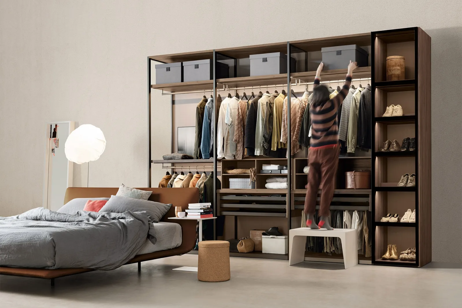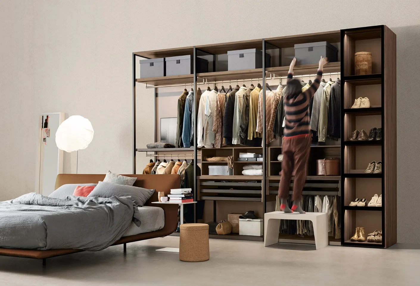 Contact us and discover more about our Home Furnishing line: you can complete the rest area by relying on a diverse availability of modern containers, such as the melamine wardrobe in the photo. Kristalia's Aria Walk-in Closet: fill out the form to receive information of all kinds and advice on how to set up the bedroom of your dreams. Wardrobe walk-in closets with hinged doors are essential elements in the night area, to furnish it to the best, practical and complete with everything.