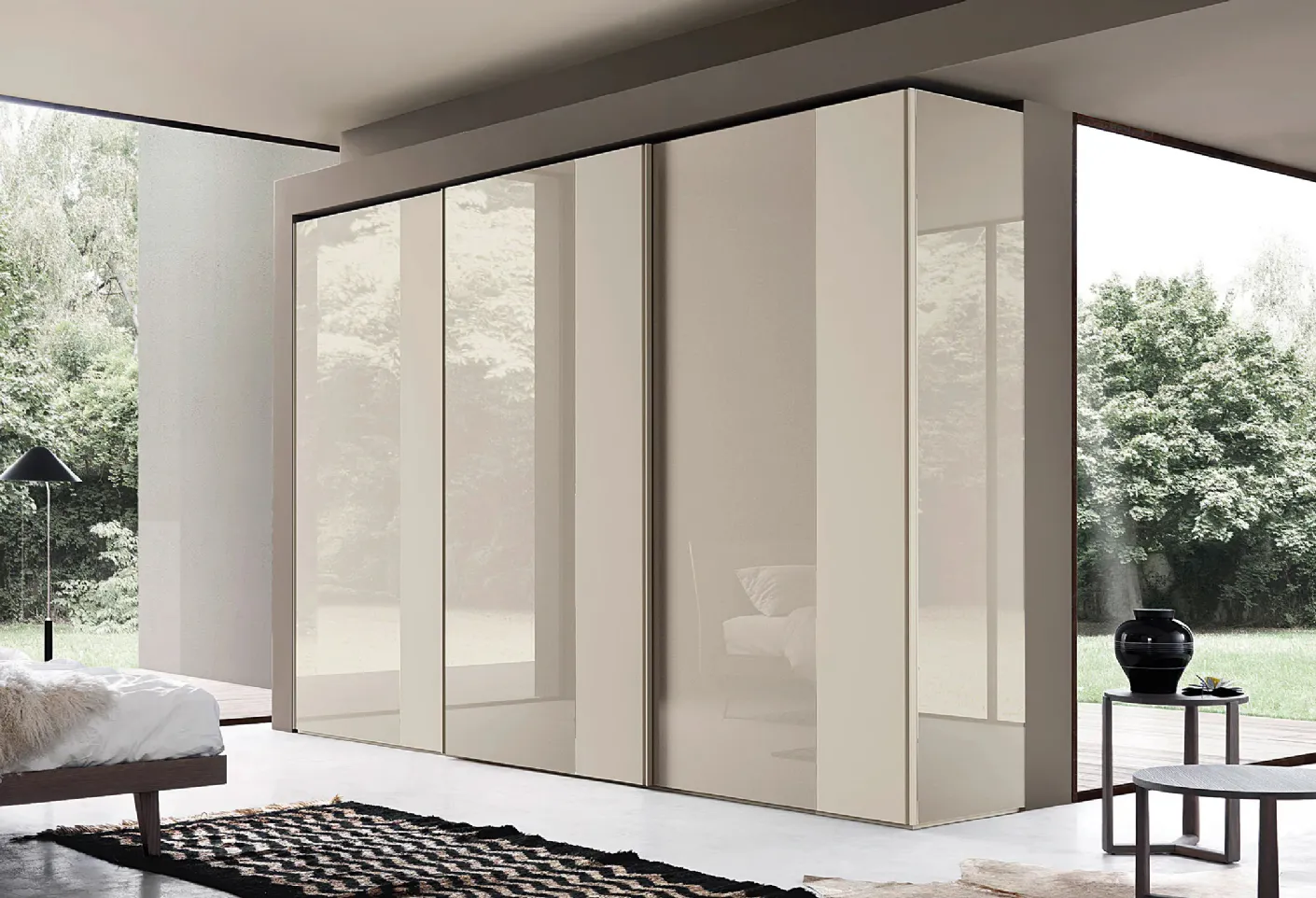Duration and comfort are aspects that, together with a certain style, characterize all the wall closets designed by the Sangiacomo brand. Coming to the store means seeing many furniture pieces from the renowned brand in person, always of high quality. If you want to create a practical and sophisticated room, fill out the form or visit us to get information, ideas, and inspiration in the field of home furnishing. Sangiacomo's Glass Synthesis Wardrobe in glass: in a rich catalog of furniture and accessories, this model will help you complete your bedroom as you have always dreamed of. A wide variety of glass furnishings like this wardrobe with sliding doors in the photo.