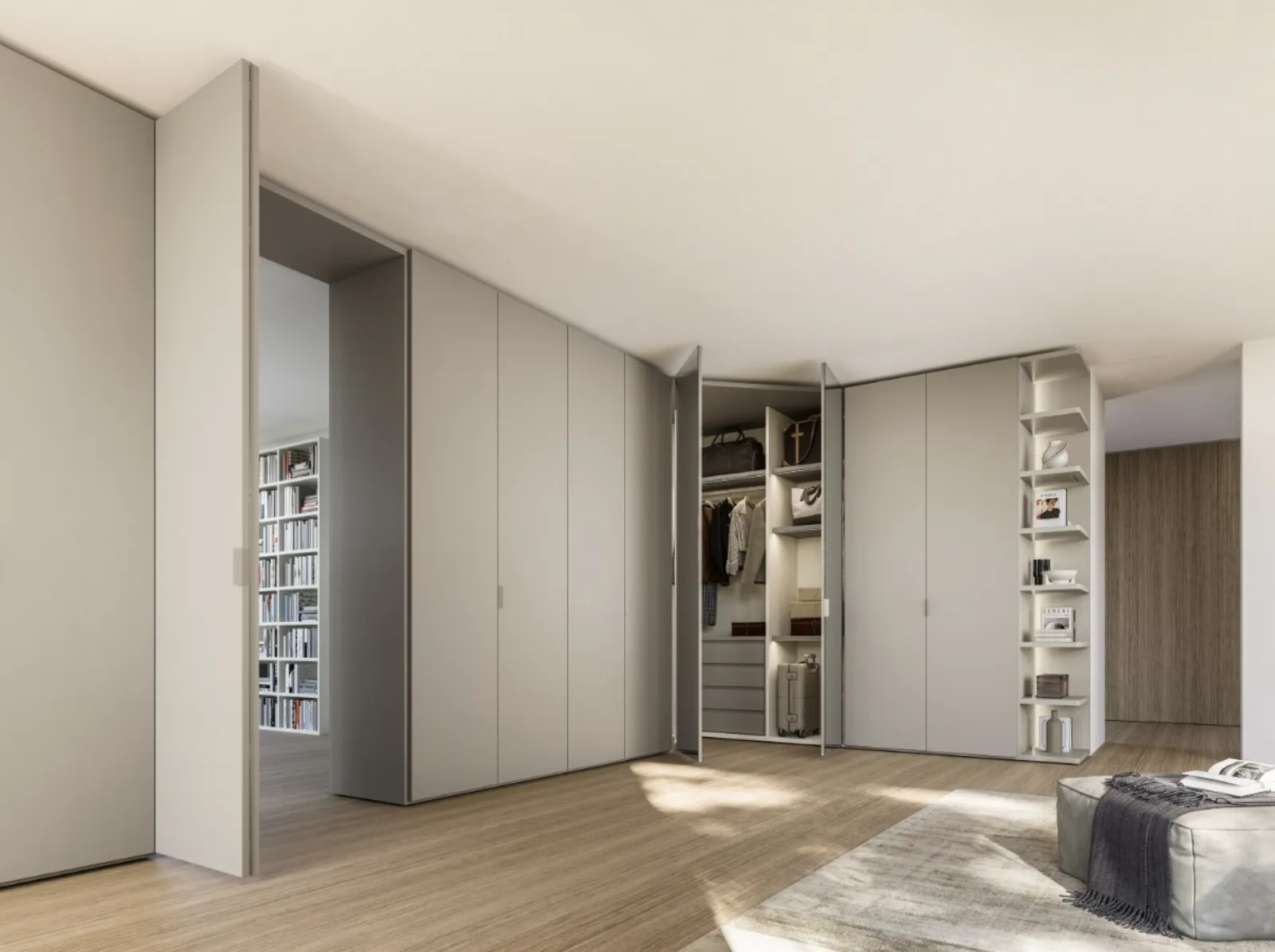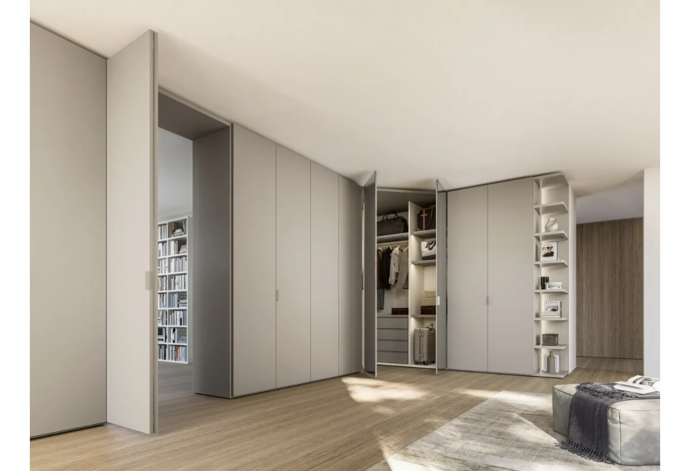 If you want corner wardrobes with hinged doors, click and discover Sangiacomo's Terminale Angolare Anta Liscia wardrobe in matte lacquer.